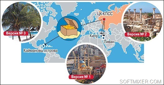 Версия № 2 - Кипр. В восьмидесятые годы эта офшорная зона лидировала по числу фирм - «друзей КПСС», которые по заказу Москвы открывала компартия Греции. Фирмы регистрировали на подставных владельцев, и часть из них занималась транспортировкой золота. В декабре 1991 года ВСЕ эти конторы были закрыты.