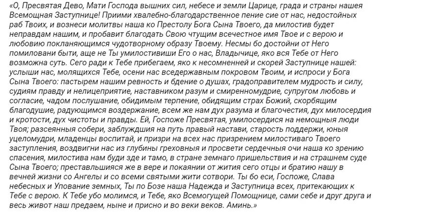 На праздник Покрова Пресвятой Богородицы христиане молят о защите и помощи Царицу Небесную: "Помяни нас в своих молитвах, о Владычица Пресвятая Дева Мария, чтобы мы не погибли от умножения наших грехов. Защити нас от всякого зла и от тяжких бед, ибо на тебя мы надеемся, и, почитая Праздник твоей Защиты, мы возвеличиваем тебя.”