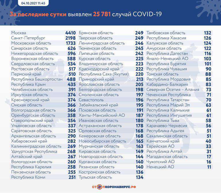 Статистика коронавируса сегодня, 4 октября 2021 в России, Москве, СПб: данные об умерших и заболевших сегодня 4.10.21