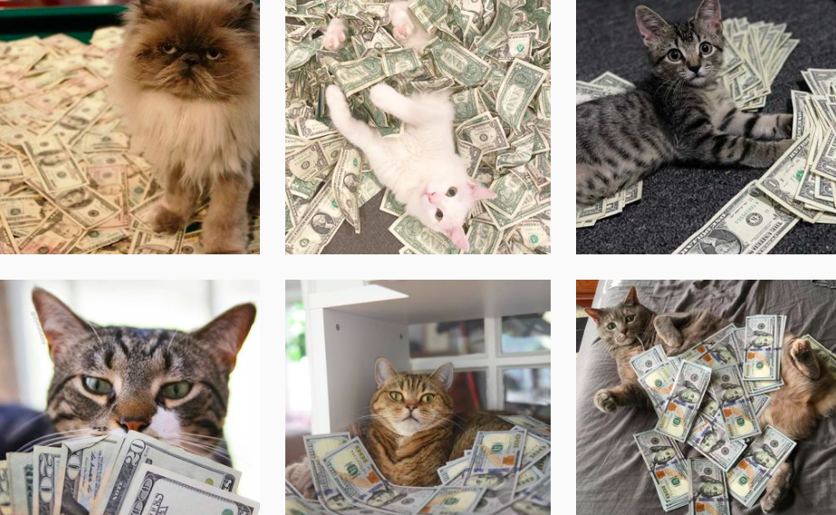 У аккаунта @cashcats почти 150 тысяч подписчиков. На страницах этого аккаунта можно увидеть лакшери-фотографии кошек. Домашние животные в окружении драгоценностей, денег, элитного алкоголя выглядят вполне гармонично, и желающих понаблюдать за этим становится все больше с каждым днем.