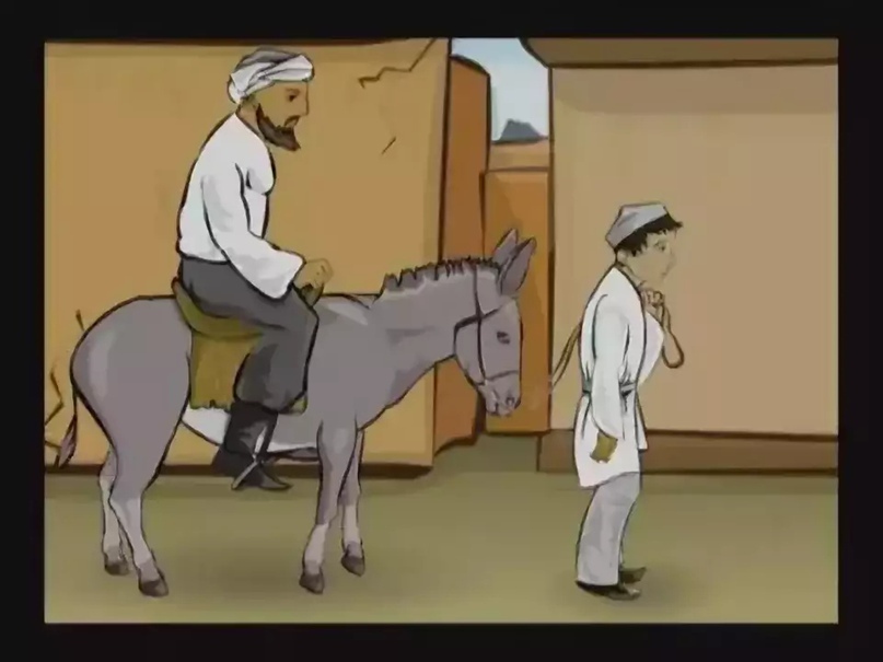 Как-то раз отец со своим сыном и осликом в полуденную жару путешествовал по пыльным улицам города. Отец сидел верхом на осле, а сын вёл его за уздечку.