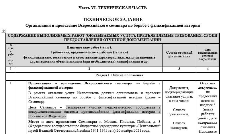 Всего планируется участие минимум 685 участников: среди них учителя школ и другие педагоги со всей России. Для них устроят панельные дискуссии, мастер-классы и экскурсионную программу. Заказчик также требует минимум трех экспертов: историков, представителей «экспертного сообщества в сфере противодействия фальсификации истории».