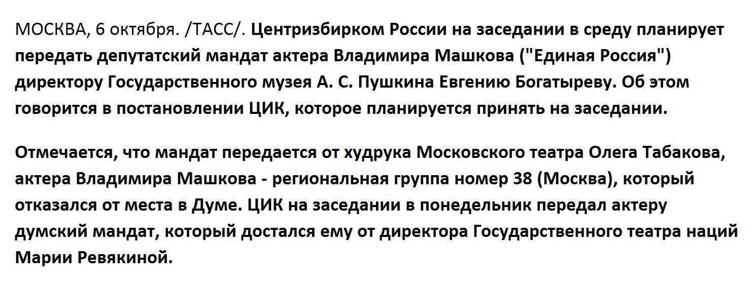 Художественный руководитель театра Олега Табакова, актёр и режиссёр Владимир Машков настырно пробивался в Государственную Думу в составе озорной и пробивной команды партии «Единая Россия», но выборы проиграл. Неунывающие, правящие друзья помогли Машкову и подкинули ему мандат директора Государственного театра наций Марии Ревякиной. И вот, он от него отказался...
