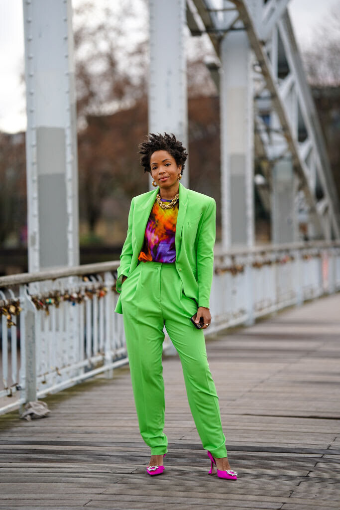 Стереотип о том, что осенью нужно носить лишь черный и все его оттенки, давно остался в прошлом. Сохраните палитру яркой, надев неоново-зеленый жакет поверх такого же яркого топа.