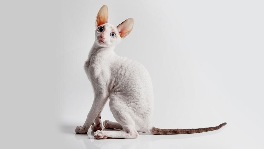 Кошка, внешность которой далека от классических стандартов настолько, что её можно принять за неземное существо. По телосложению корниш-рекс похож на борзую собаку – гибкое, мускулистое длинное тело, высокие лапы, длинный хлыстоподобный хвост. Тем не менее, в изяществе ему не отказать. Чего стоит одна только густая, короткая, слегка кучерявая шерсть. На фоне худощавого тела и маленькой головы уши корниш-рекса выглядят огромными.