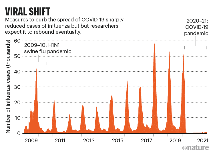 Поскольку в Северном полушарии якобы начинается сезон простуды и гриппа, исследователи предупреждают, что следует ожидать неожиданного. «Если кто-то говорит вам, что он знает, он не знает», - говорит эпидемиолог Джон Пэджет из Нидерландского института исследований в области здравоохранения в Утрехте. Большинство согласны с тем, что грипп в конечном итоге восстановится, возможно, резко, поскольку ограничения на поездки и общественные меры, направленные на обуздание коронавируса, такие как ношение масок, уменьшатся. «Когда мы откажемся от соблюдения правил здорового образа жизни, грипп, скорее всего, сильно ударит», - говорит Роберт Уэр, клинический эпидемиолог из Университета Гриффита в Квинсленде, Австралия.