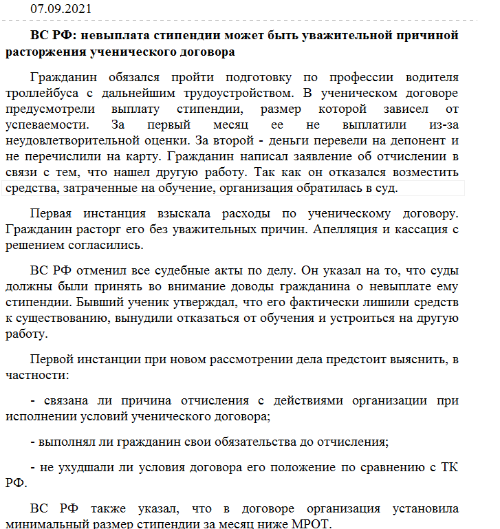 ВС РФ: невыплата стипендии может быть уважительной причиной расторжения ученического договора