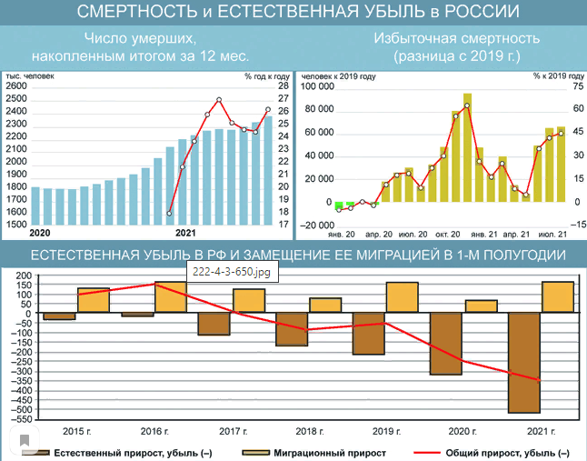 Демограф Алексей Ракша подсчитал, что совокупно с октября 2020 года по сентябрь 2021-го естественная убыль населения в России окажется на уровне 997 тыс. человек и станет самой большой в мирной истории. По мнению эксперта, главная причина убыли населения – высокая смертность. «Почти весь прирост смертности – из-за заражений COVID-19, а не «от паники» или «отказах в плановом медобслуживании», – рассказывает он.