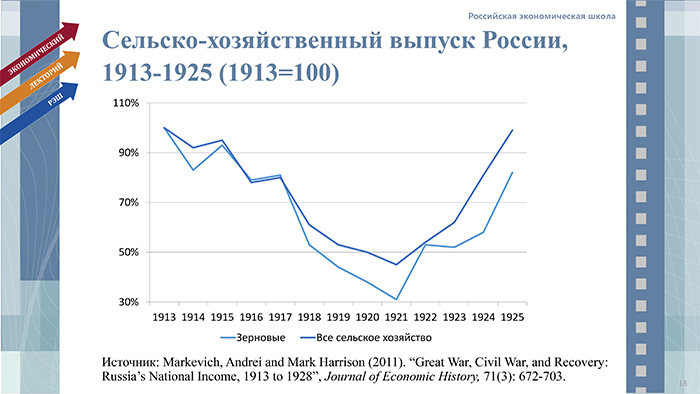 По графику же выпуска с/х продукции видно, что революция и гражданская крайне негативно повлияла на этот сектор экономики, хуже чем первая мiровая. Только к 1925г смогли восстановить, то что уже было достигнуто в 1913г. И тут нужно отметить еще тот факт, что 1913г. - это все же еще только зарождение машиностроения (трактора и проч. с/х техника). По результатам Первой мировой войны и революций 1917 г объем валовой продукции промышленности России в 1917 г. упал по сравнению с 1913 г. на 29%. Но ущерб тяжелой промышленности от гражданской войны в результате боевых действий не был существенным. Тяжелая промышленность была восстановлена в короткие сроки. И тем не менее в 1925г. только приблизились к уровню 1913г.