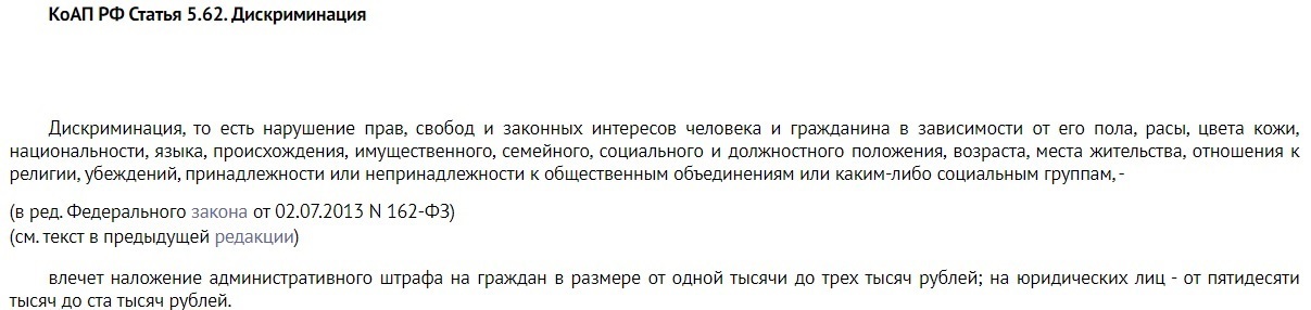 В прокуратуре сказали, что таксист таким образом нарушил закон и дело в отношении 35-летнего иностранца возбуждено по ст. 5.62 КоАПП РФ «Дискриминация». Таксист, нарушивший права женщины, признал свою вину и привлечен к ответственности. Вот статья о наказании за дискриминацию.