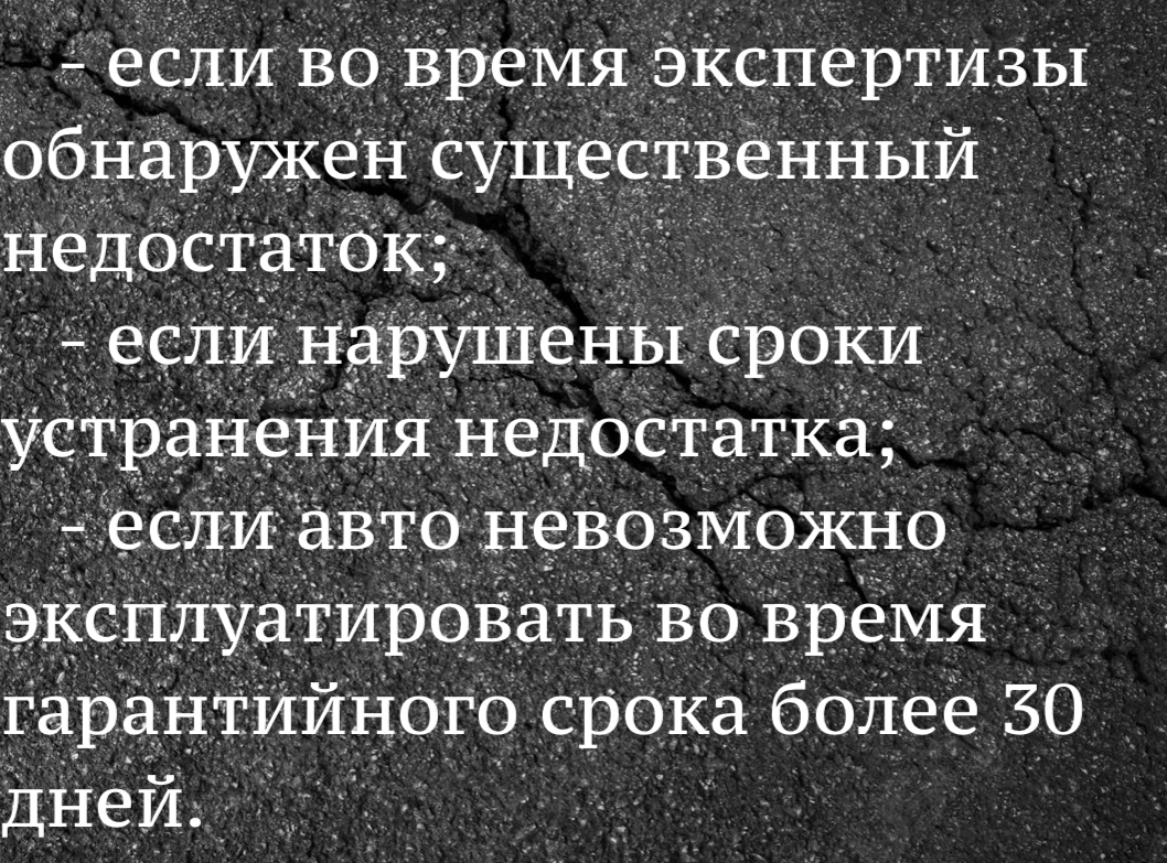 Роспотребнадзор разъяснил, в каких именно случаях потребитель имеет право на законных основаниях возвратить или потребовать замену купленного автомобиля. Это: