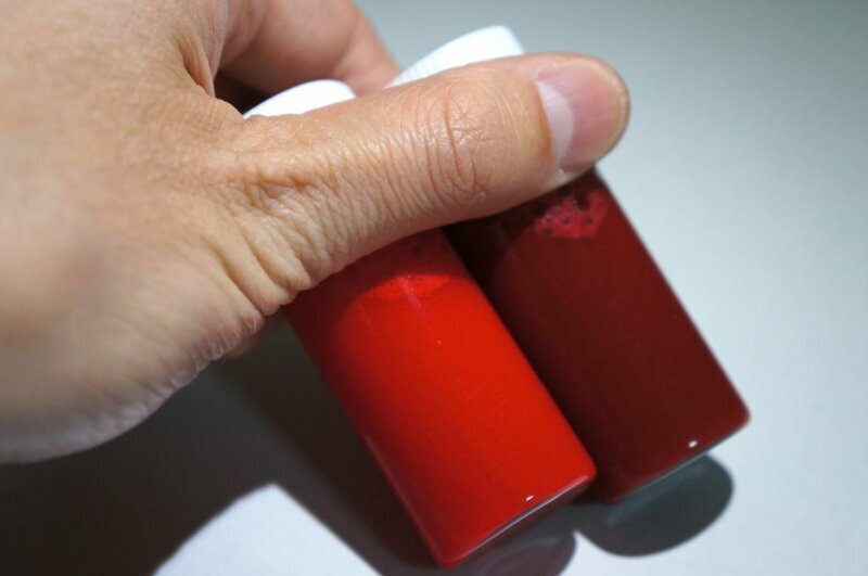 Есть альтернативный вариант: берем стакан воды, добавляем туда немного молока и несколько капель томатного сока, чтобы раствор получил телесный оттенок. Затем берем пробирку с красным вином (оно хорошо сымитирует кровь) и помещаем ее в стакан с жидкостью. В итоге мы увидим, что сквозь слой молока и томатного сока, красное вино приобрело синеватый оттенок.
