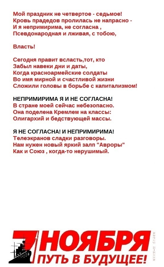 Я никогда не буду единым с тем, кто жирует за счёт народа, и вообще какой это праздник день единства...с кем ?? Единение с буржуем-олигархом жирующим за наш счёт?Ну какое может быть единство олигархов и нищих.Какое может быть единство большинства народа и чубайса,сечина,миллера с сотоварищами,обобравшими этих людей..Может быть только классовая борьба...Нет не собирался и не собираюсь!Мой праздник только 7 ноября, как и моё знамя только Красного цвета!!!