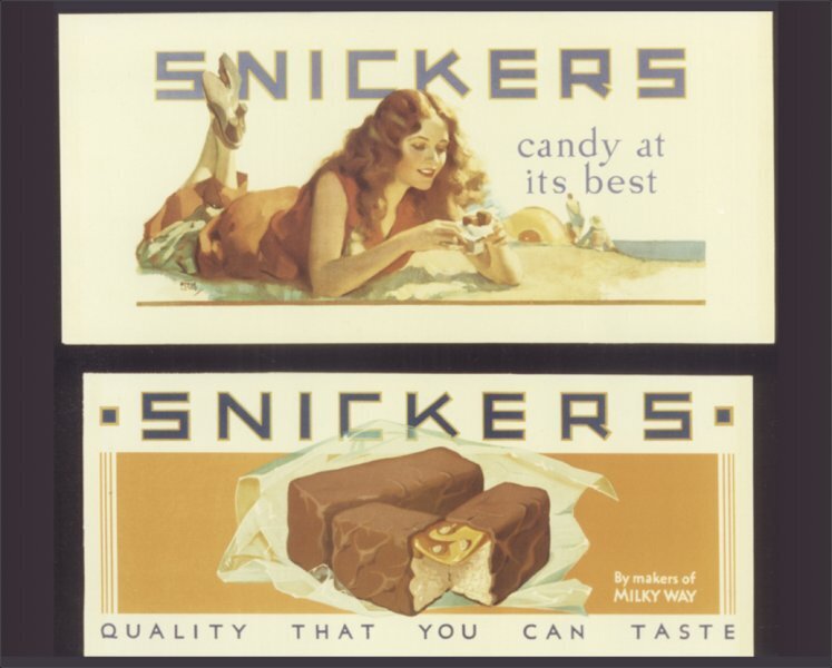 1930 год, батончик Snickers. На рекламе красуется лозунг: «Качество, которое можно попробовать на вкус». Интересно, что по фотографии можно обратить внимание на то, каким был сам батончик, видно, что он был как бы вертикальным. Сейчас его перевернули и начинку внутри сделали, современный батончик стал горизонтальным и более плоским: