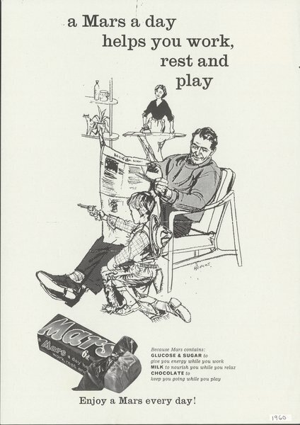 А вот батончик Mars в 1960 году, производители всегда придумывали яркие слоганы, ну вот например один из них: «Один Марс в день, помогает работать, отдыхать и играть». Кстати упаковка за 60 лет особо не поменялась, есть большие сходства с нынешней, хотя материалы конечно изменились: