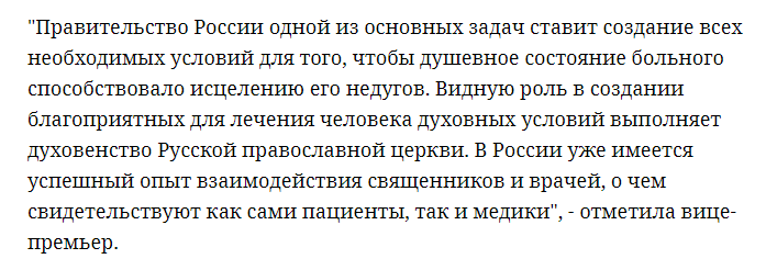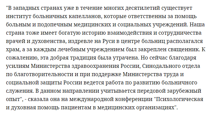 На днях вице-премьер и главная по национальному проекту «Здравоохранение», то есть чиновник, контролирующий улучшение качества и доступности государственных медицинских услуг, Татьяна Голикова, рассказала о возможности воссоздания на территории больниц религиозных объектов.