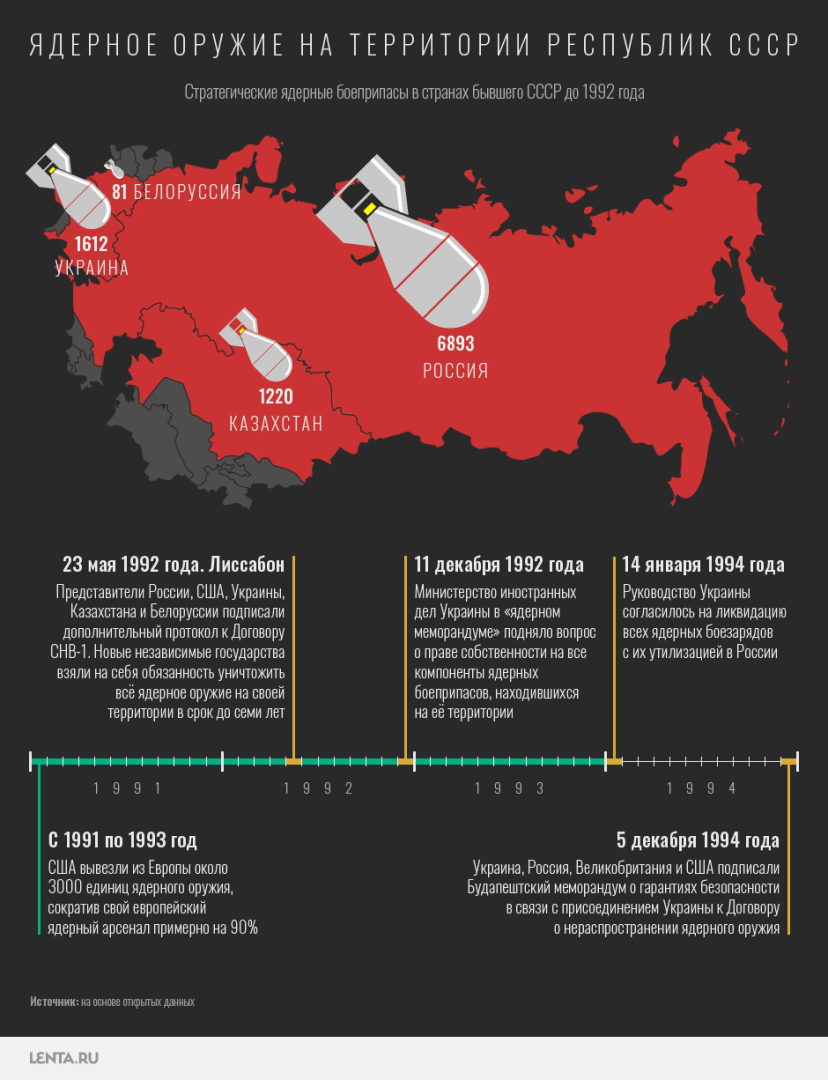 Окончательно денуклеаризация Украины была закреплена в 1994 году. Подписав Будапештский меморандум, страна сдала советские боеголовки и получила взамен гарантии ядерной безопасности. После присоединения Крыма и конфликта в Донбассе на Западе заговорили о нарушениях этих договоренностей со стороны российского государства. Такие заявления как минимум спорны — Будапештский меморандум носит декларативный характер и не был ратифицирован ни одной из стран, подписавших его. Однако теперь Украина в связи с этим угрожает вернуть себе ядерный статус.