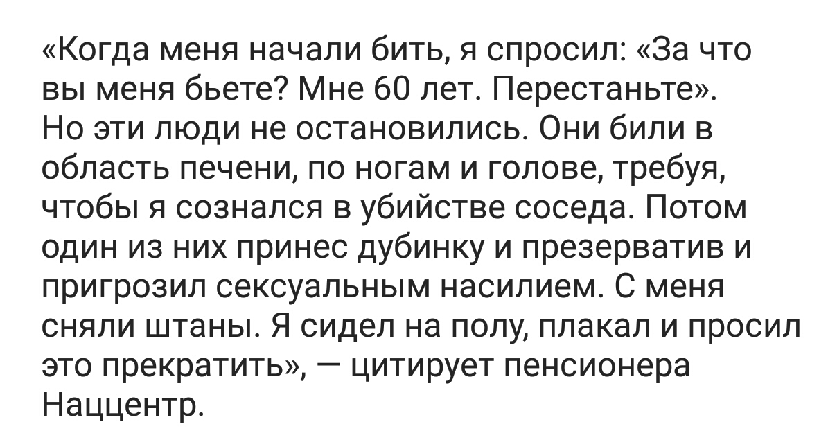 «Я испытывал дикую боль внизу живота и в паху. Пока я был на полу, другие сотрудники били меня ногами по спине», — заявил Швецов. Кроме того, один из оперативников велел ему раздеться. «Я отказался. Он сказал, что будет „петушить“, „поиграет в бутылочку“ со мной», — добавил он.