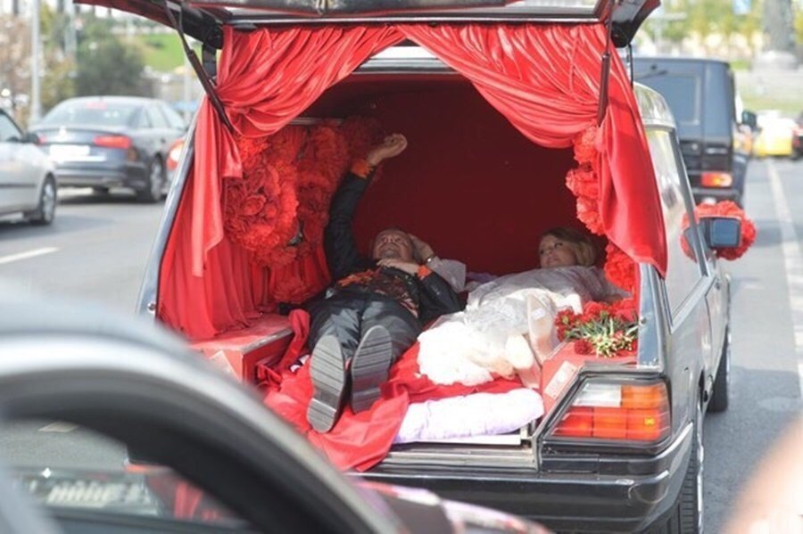 И потом я вспомнила, как 2 года назад, в сентябре 2019 года состоялась свадьба знаменитых актера, поэта, режиссера и художественного руководителя театра К. Богомолова и телеведущей К. Собчак. И на чем они приехали в ЗАГС. - Правильно! На катафалке.