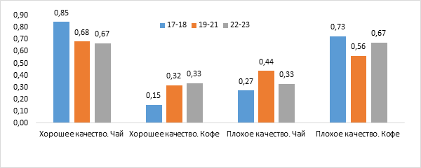 Согласно подсчетам, 54,4% респондентов имеют хорошее качество сна. Анализируя взаимосвязь между качеством сна и напитком, которому респондент отдает предпочтение, отмечается следующая зависимость (рис. 2): улучшение качества сна у возрастных групп, отдающих предпочтение напитку, содержащему меньшую концентрацию кофеина (чай).
