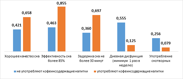 Основные показатели качества сна PSQI у респондентов, употребляющих и не употребляющих кофеинсодержащие напитки отражен на рисунке 1. Студенты, употребляющие кофеинсодержащие напитки, имеют более низкое качество, эффективность сна, большую задержку и дисфункцию сна. Употребление респондентами хотя бы одного стимулирующего напитка в неделю в 1,31 раза снижает основные характеристики качества сна.