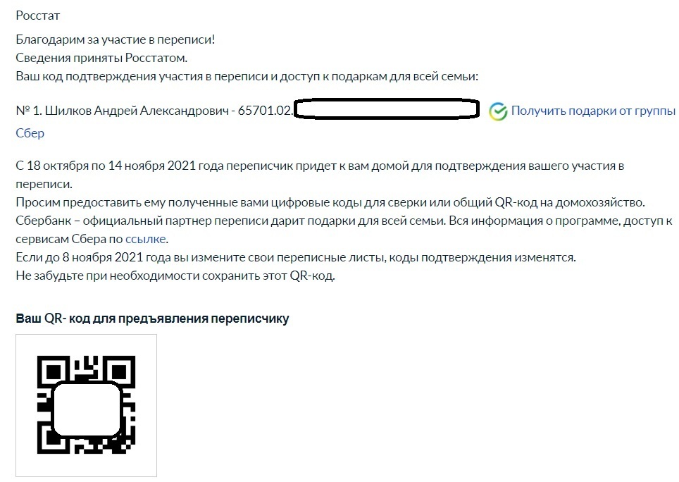 Также вы можете выписать цифровой код, который указан рядом с вашим ФИО. Переписчик по нему определит, что вы уже прошли перепись.