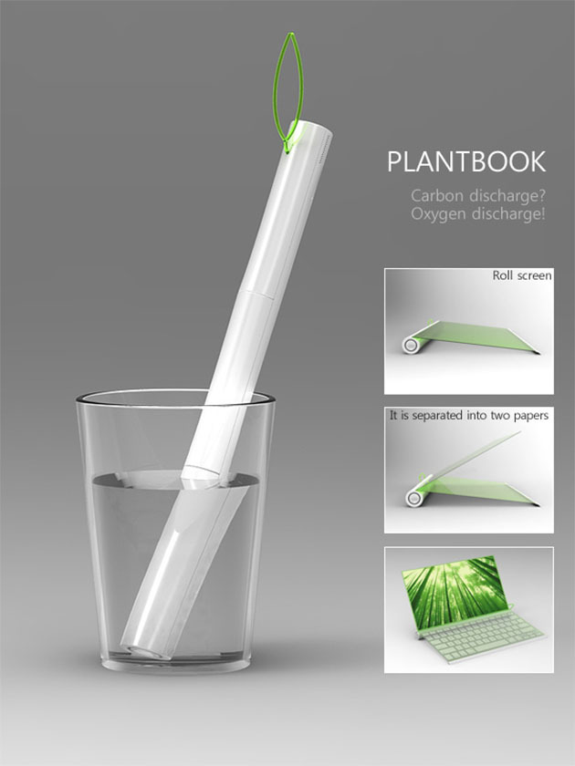 Поскольку он сможет сворачиваться в трубочку, то и зарядка будет происходить именно так. От этого и название - растение (plant). После того как Вы поработали на ноутбуке, Вы его сворачиваете в трубочку и кладёте в стакан с водой. Звучит глупо и непонятно, но авторы проекта так не считают. Благодаря некоторым свойствам воды дизайнеры считают, что они смогут заряжать его таким образом. Plantbook будет поглощать CO2 и выделять кислород.