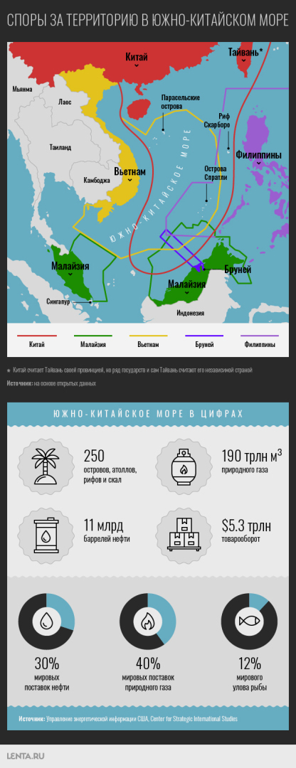 Территориальный спор — а вернее даже споры — вокруг Южно-Китайского моря длится уже несколько десятилетий. Основные участники — Бруней, Вьетнам, Китай, Малайзия, Тайвань и Филиппины. Основной предмет разногласий — две группы крохотных островков, рифов и скал: архипелаг Спратли на юге и Парасельские острова на севере. На первый взгляд это может показаться довольно странным. Взять архипелаг Спратли, на который претендуют все шесть стран: суммарная площадь входящих в его состав островов и рифов всего пять квадратных километров.