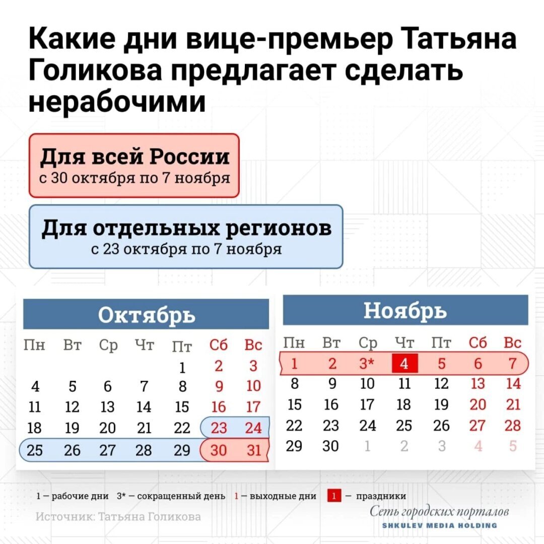 Руководитель оперштаба по борьбе с коронавирусной инфекцией в России Татьяна Голикова обратилась к Владимиру Путину с предложением ввести с 30 октября по 7 ноября нерабочие дни.