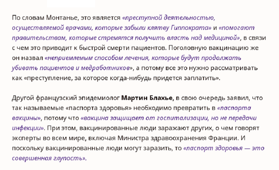 Политолог привел слова именитых вирусологов и эпидемиологов, которые выступают против оголтелой вакцинации. В частности, были приведены слова нобелевского лауреата Люка Монтанье, которые он произнес 12 августа 2021 года, резко ужесточив свою риторику против вакцинаторов от COVID-19, навязывающих ее миру.
