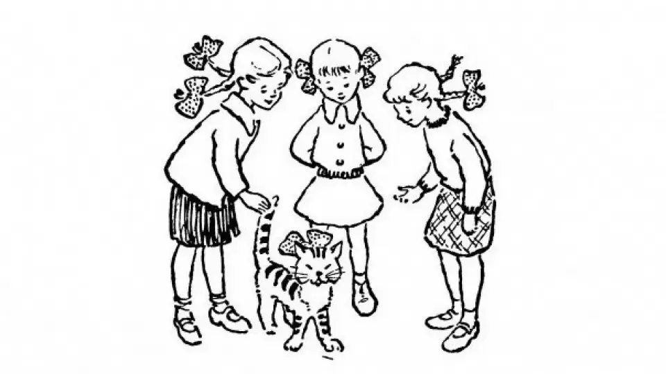 На картинке изображены три подружки и кот Мурзик. Кто из девочек – хозяйка Мурзика?