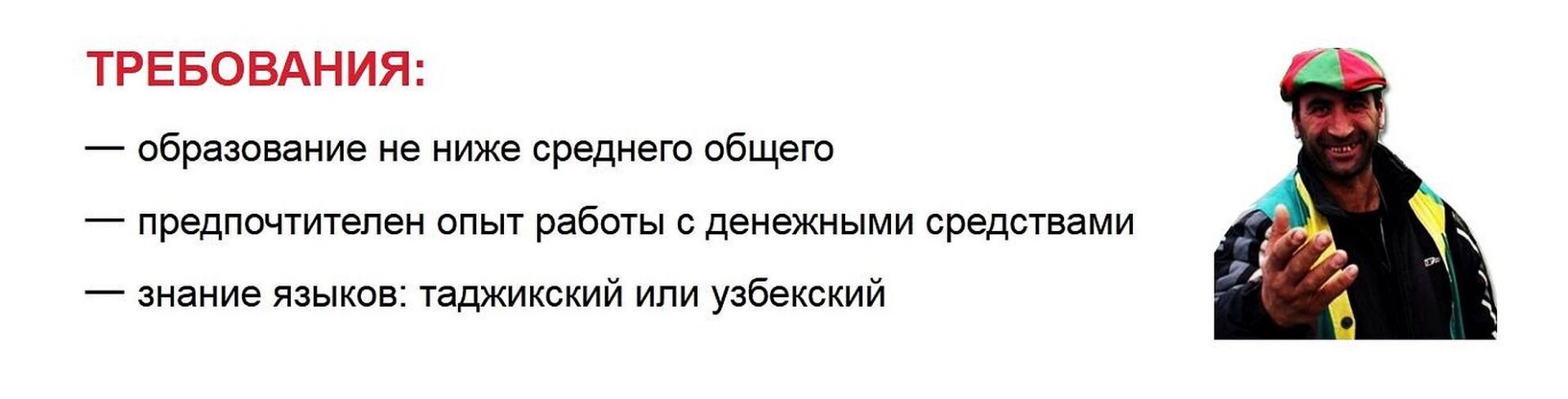 После революционного размещения информационных знаков на языках лучших трудовых друзей России, подземные властители Москвы опубликовали на портале поиска работы Headhunter объявление о том, что им требуются кассиры со средним образованием, опытом работы с денежными средствами и знанием таджикского или узбекского языка. Зарплата кассира-интернационалиста начинается от 39 тысяч рублей. Вот так.