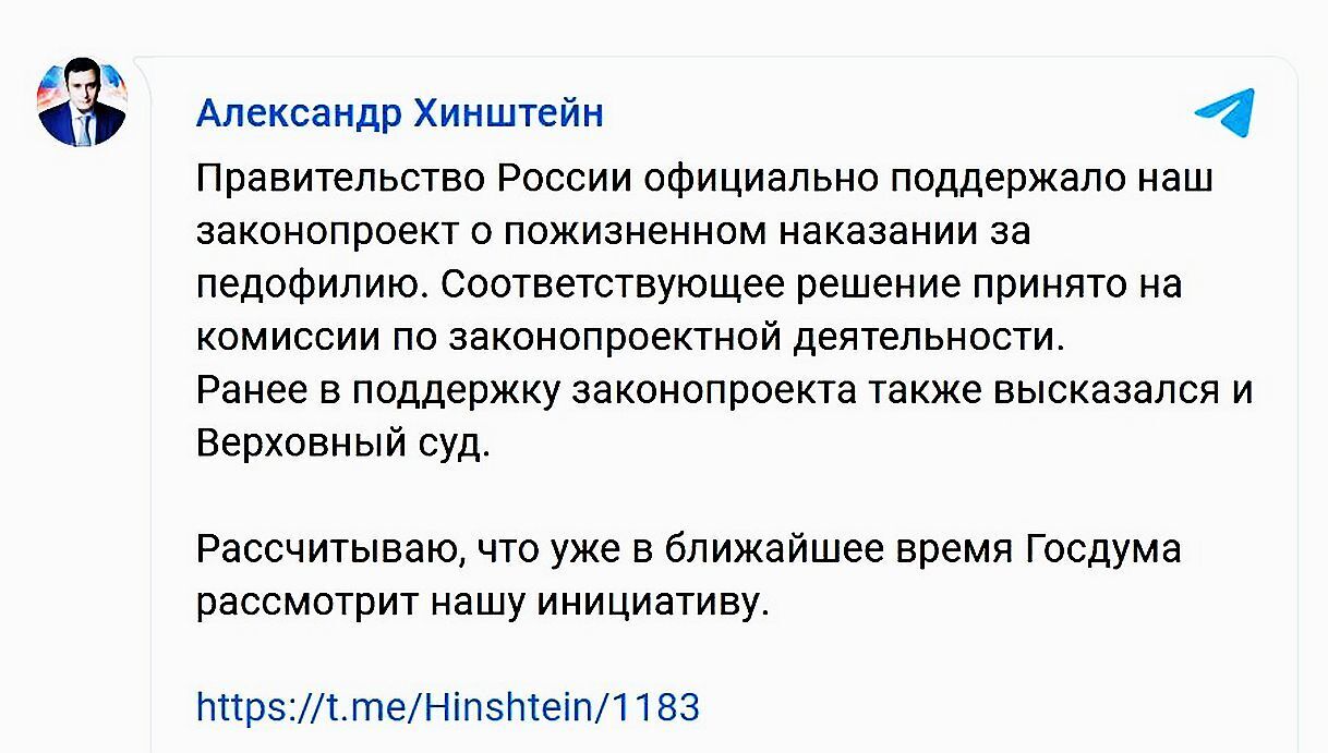 То, о чём так долго мечтали все порядочные граждане России начинает, наконец-то воплощаться в жизнь. Депутат Государственной Думы Александр Хинштейн сообщил в своём Телеграм-канале, что правительство России поддержало законопроект о применении пожизненного наказания для педофилов.