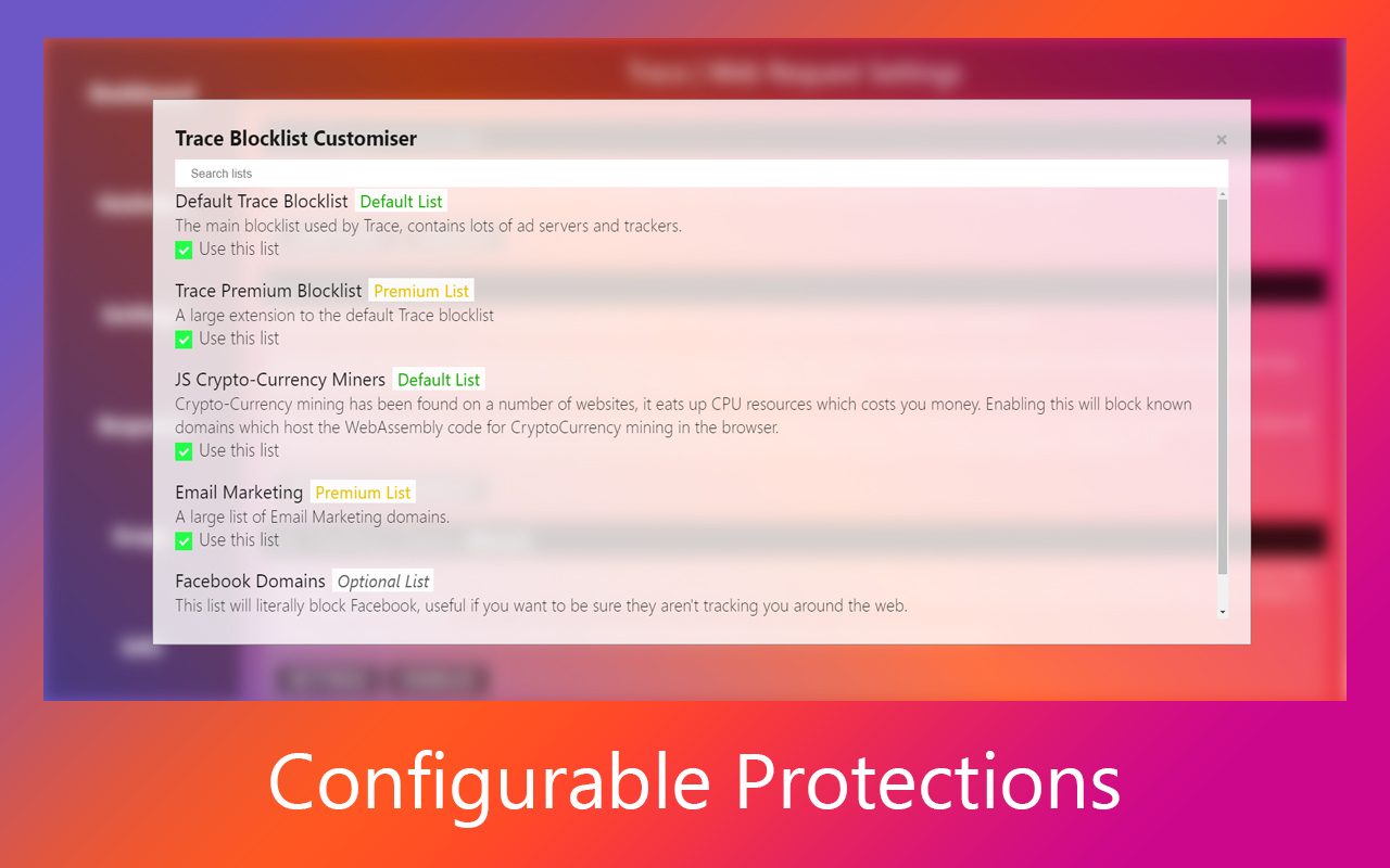 Расширение, которое может защитить множество различных типов отпечатков браузера, таких как Canvas / Audio / WebGL Fingerprinting. Trace также предлагает функции очистки URL-адресов и редактирования заголовков, такие как средство для удаления файлов cookie и удаления заголовков Google.
