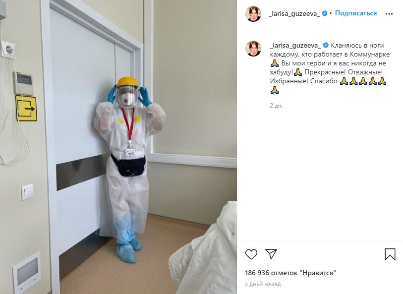 Об этом стало известно из поста артистки в ее Instagram****. "Кланяюсь в ноги каждому, кто работает в Коммунарке. Вы мои герои и я вас никогда не забуду! Прекрасные! Отважные! Избранные! Спасибо", - написала Гузеева.