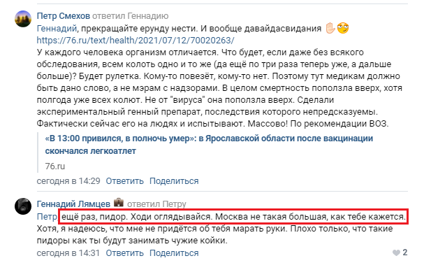 Слава Богу, в стране еще не столько упоротых отморозков. Пока что всего лишь 14 человек. Но, вакцинация идет, и люди теряют здравое мышление. Со временем вакцинированные начнут терять контроль над собой и начнут призывать к уничтожению антиваксеров. Наиболее упоротые уже сейчас готовы убивать нормальных людей, которые не хотят вливать в себя экспериментальную жижу.