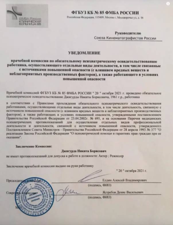 Российский актёр театра и кино Никита Джигурда обнародовал свежую справку от психиатра перед боем с телеведущим Отаром Кушанашвили. Как рассказал артист в беседе с РИА ФАН, врачам пришлось выдать ему сей квиток, чтобы он смог поучаствовать в съёмках шоу.