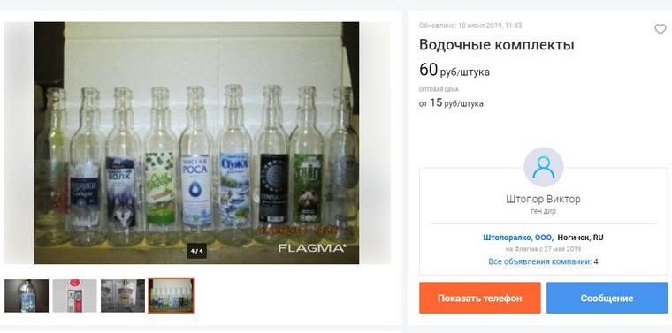 Всего лишь беглый поиск в интернете по запросу «купить тару для водки» привел корреспондента URA.RU на торговую площадку FLAGMA, позиционирующую себя как международную бизнес-платформу. Здесь сотни мелких предпринимателей со всей страны размещают объявления с предложениями о продаже или покупке товара и оказании различных услуг.