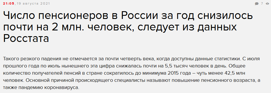В качестве средства для изменения ситуации власть в РФ выкатила пенсионную реформу с постепенным повышением пенсионного возраста (до 60 лет для женщин и до 65 лет для мужчин).