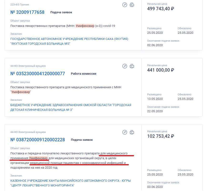 Якутия, допустим, как следует из информации с портала госзакупок, заключила контракты на покупку арбидола на 700 тысяч рублей, а умифеновира (это другое наименование, напомним) – на полмиллиона, Центр лекарственного обеспечения Депздрава Москвы – на 14,5 млн, Хакасия – на миллион, Омская область – на 441 тысячу, Новосибирская – на 393 тысячи, Оренбургская – на 1,5 млн, Ивановская – на 542 тысячи, Мурманская – на полтора миллиона и так далее.