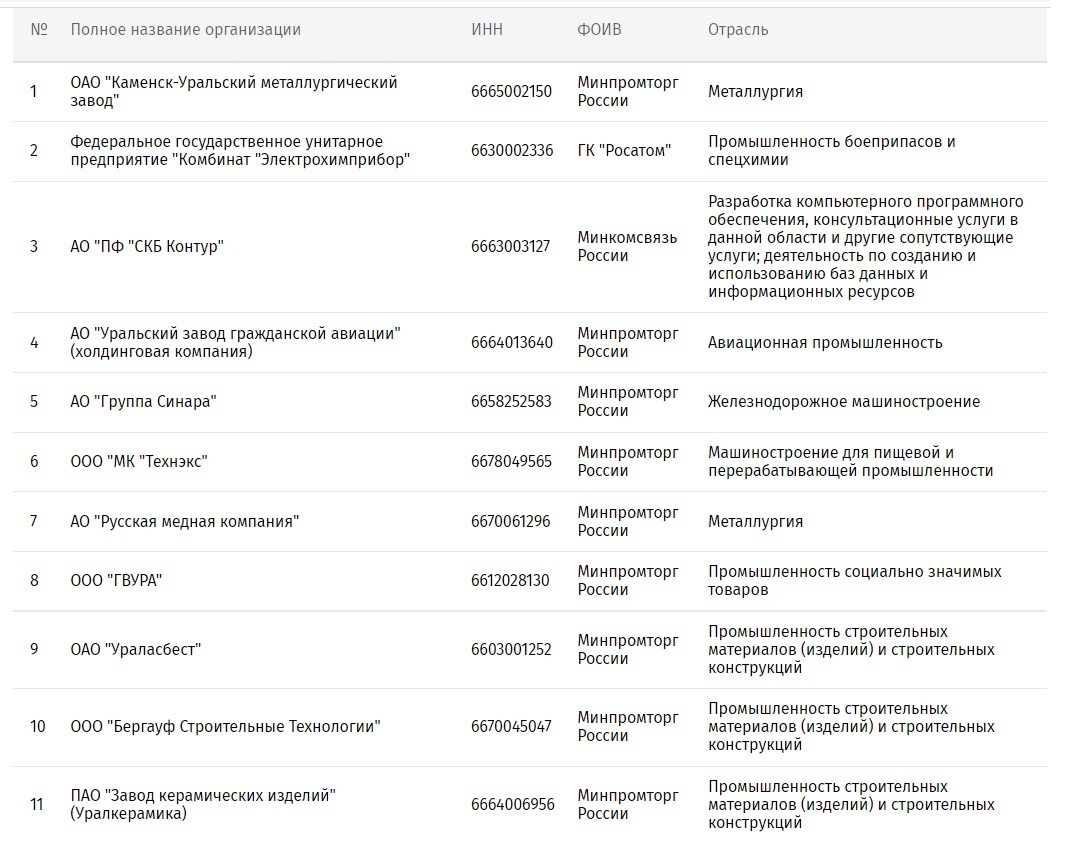 В число данных предприятий входит 34 компании на территории всей Свердловской области: