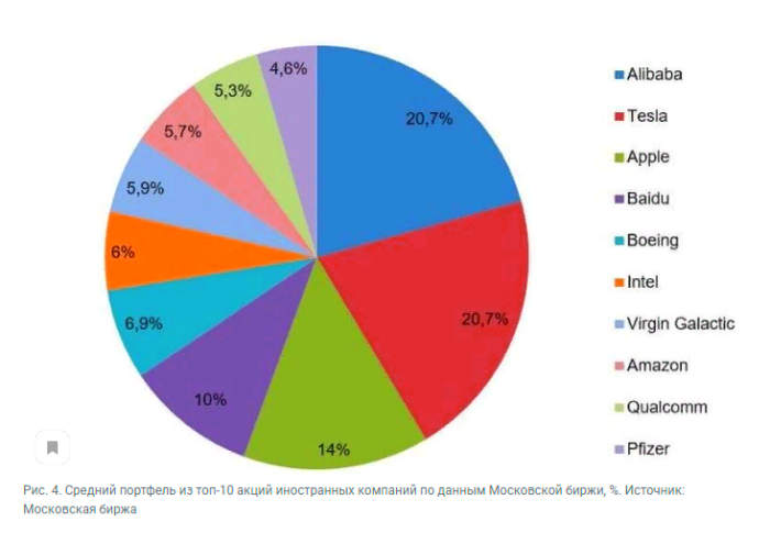 Среди иностранных компаний наибольшей популярностью у российских инвесторов пользуются компании Alibaba (20,7%), Tesla (20,7%) и Apple (14,2%). Далее идут акции не менее известных компаний в области IT, космической и исследовательской индустрии — Baidu, Boeing, Intel, Virgin Galactic, Amazon, Qualcomm. Отдельного внимания заслуживает инновационная фармацевтическая компания Pfizer, которая занимается разработкой вакцины от COVID-19.
