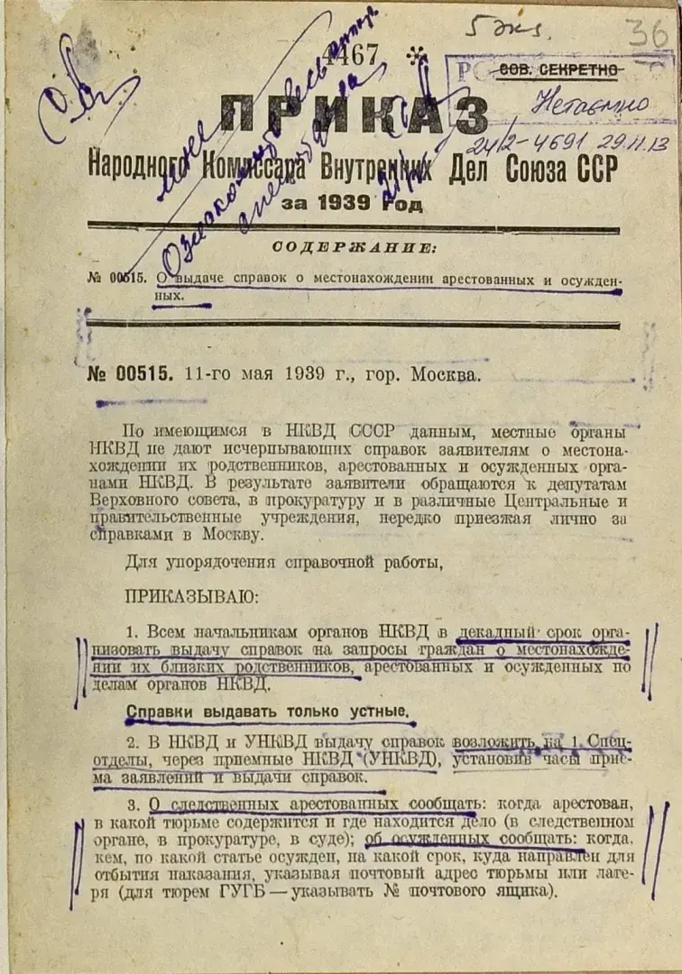 Приказ Народного Комиссара Внутренних Дел Союза ССР за 1939 год. № 00515. О выдаче справок о местонахождении арестованных и осужденных.