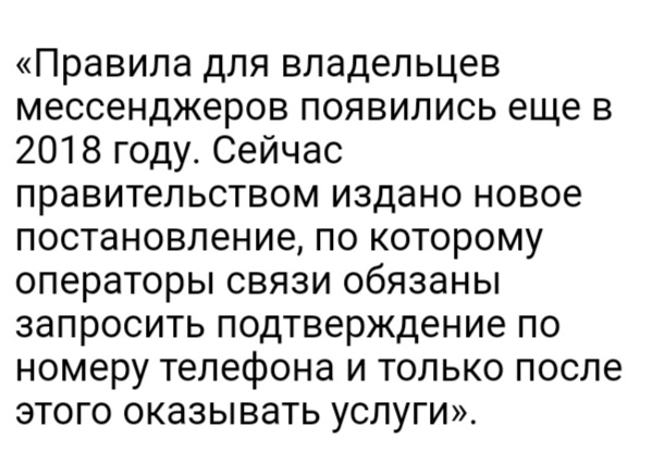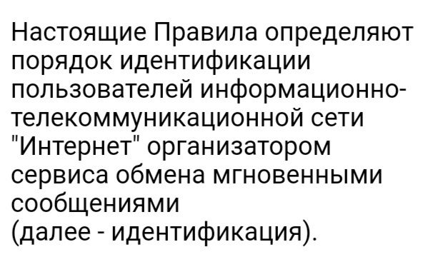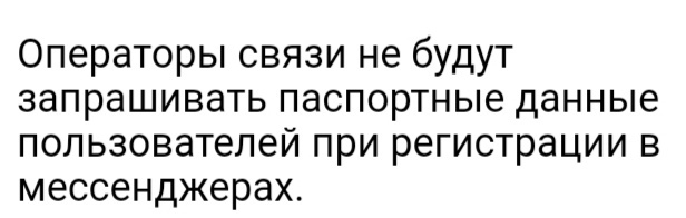 Как сообщают многочисленные источники, по новым правилам, россияне смогут пользоваться интернет-мессенджерами только после прохождения индентификации путем достоверного установления сведений об абонентском номере и сообщения паспортных данных.