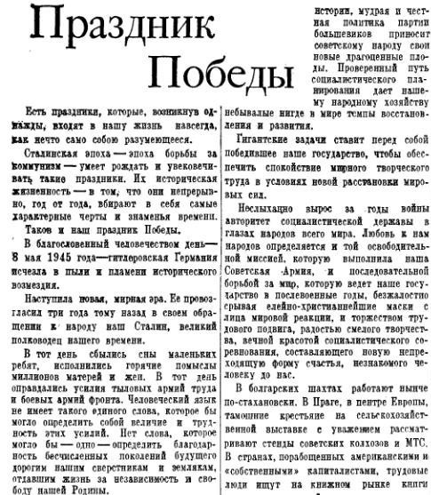 Опять укросми пошли.. Окончание войны ПОБЕДОЙ СССР . ПРАЗДНИК был всегда, начиная с 45 года.. В 46, 47 - это были выходные дни, после рабочие , но надо было восстанавливать страну , поэтому и сделали рабочим днём- ПРАЗДНИК - ДЕНЬ ПОБЕДЫ .. И , кстати, 1 января был тоже рабочим днём .Потом его сделали выходным.. Много выходных итак было, надо было заново отстраивать страну , тут не до выходных.. НО ЭТО НЕ ЗНАЧИТ, что 9 МАЯ не был ПРАЗДНИКОМ.