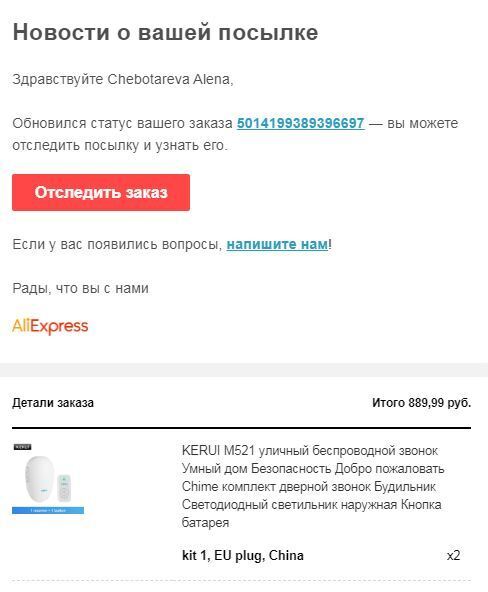 Что касаемо этих писем. После очередного заказа на этом сайте, мне на почту приходит письмо, спустя пару дней о том, что посылка наконец начала движение.