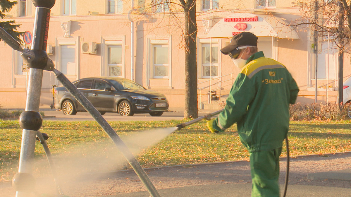 Работу ведут по решению регионального оперативного штаба по борьбе с коронавирусом. В течение двух недель, объявленных нерабочими, силами предприятий «Зеленхоз» и «Экоцентр» обработают все 36 парков и скверов, находящихся у них в обслуживании. Специальный антисептический состав, которым обрабатывают поверхности, безопасен для людей, не приносит вреда окружающей среде и зеленым насаждениям, подчеркнули экологи. Для времени обработки выбрали раннее утро, когда на детских и спортивных площадках еще нет посетителей.
