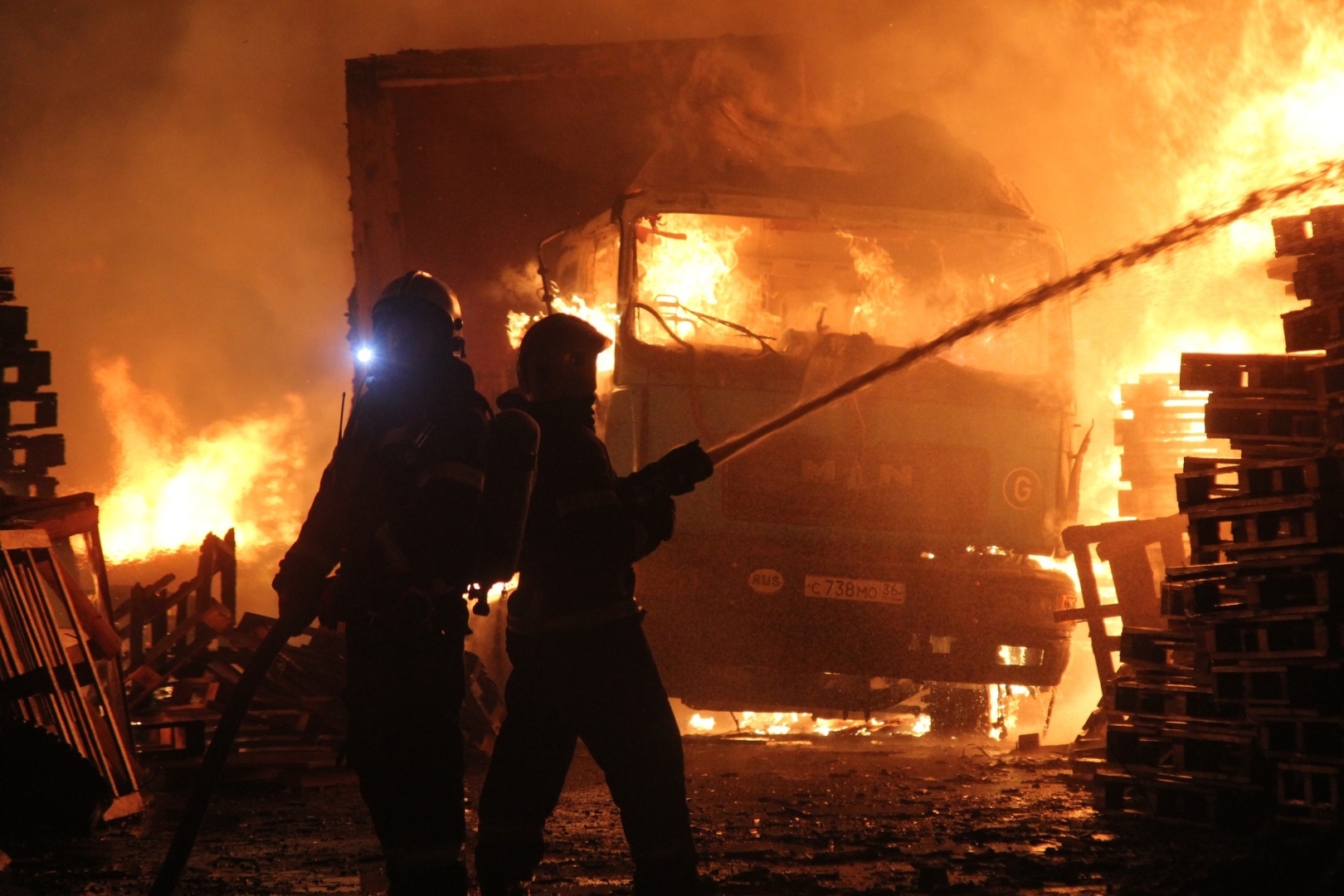 На месте работают пожарные. Огонь вспыхнул на открытой площадке, продолжается интенсивное горение.