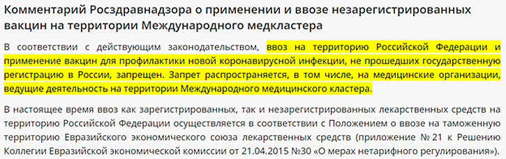 Если отвлечься от сухого законотворческого языка, то речь идёт о том, что МММК в Сколково должен получить право ввозить на территорию России и применять незарегистрированные и не одобренные в России препараты. Любые. Вообще. Отметим один из наиболее важных моментов: проект не предусматривает применение послаблений исключительно к каким-либо вакцинам. Тогда бы в документе так и было сказано. Но речь идёт вообще обо всех незарегистрированных препаратах, которые смогут ввозиться в Россию и применяться в Сколково. И это уже очень серьёзно.