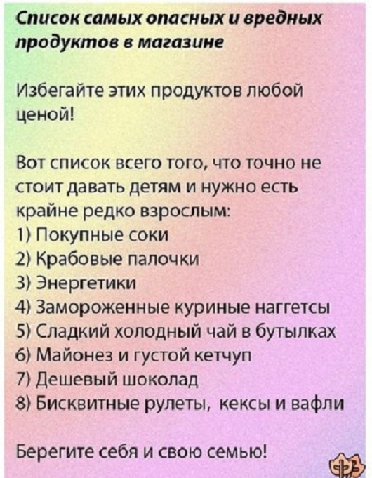 Вредными бывают только мысли и люди. А продукты они лишь продукты. Для тех, кто привык все сваливать на других и существует "список вредных продуктов"